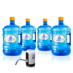 Práctico pack de soporte plástico o dispensador tipo bomba electrónica USB, incluye: 4 envases retornables de 10 litros con carga de agua purificada + 1 dispensador que selecciones. (indicar la selección del dispensador en las observaciones del pedido).